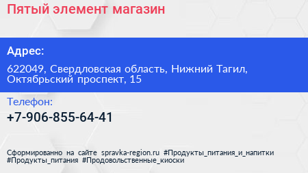 Пятый элемент, магазин по адресу 622049, Свердловская область, Нижний Тагил, Октябрьский проспект, 15 в дальнейшем Организация, размещена в следующих категориях: