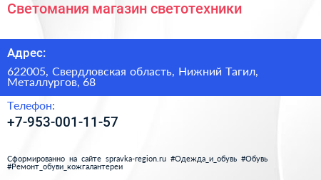 Светомания, магазин светотехники по адресу 622005, Свердловская область, Нижний Тагил, Металлургов, 68 в дальнейшем Организация, размещена в следующих категориях: