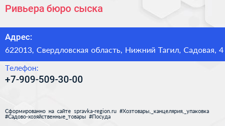 Ривьера, бюро сыска по адресу 622013, Свердловская область, Нижний Тагил, Садовая, 4 в дальнейшем Организация, размещена в следующих категориях: