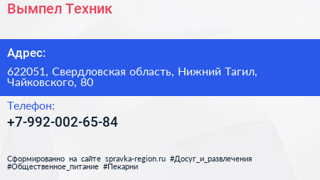 Вымпел-Техник по адресу 622051, Свердловская область, Нижний Тагил, Чайковского, 80 в дальнейшем Организация, размещена в следующих категориях: