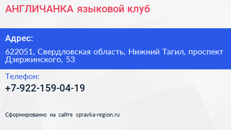 АНГЛИЧАНКА, языковой клуб по адресу 622051, Свердловская область, Нижний Тагил, проспект Дзержинского, 53 в дальнейшем Организация, размещена в следующих категориях: