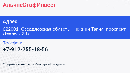 АльянсСтафИнвест по адресу 622001, Свердловская область, Нижний Тагил, проспект Ленина, 28а в дальнейшем Организация, размещена в следующих категориях: