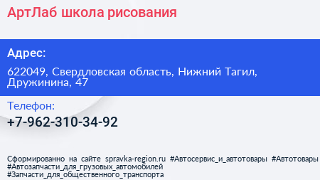 АртЛаб, школа рисования по адресу 622049, Свердловская область, Нижний Тагил, Дружинина, 47 в дальнейшем Организация, размещена в следующих категориях: