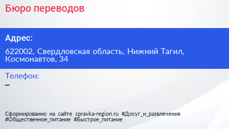 Бюро переводов по адресу 622002, Свердловская область, Нижний Тагил, Космонавтов, 34 в дальнейшем Организация, размещена в следующих категориях: