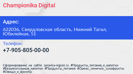 Championika Digital по адресу 622036, Свердловская область, Нижний Тагил, Юбилейная, 51 в дальнейшем Организация, размещена в следующих категориях: