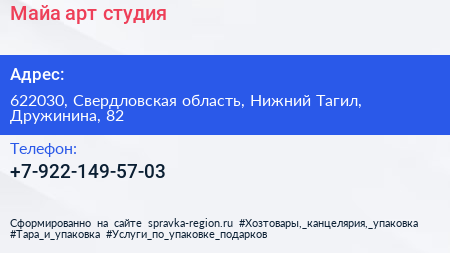 Майа, арт-студия по адресу 622030, Свердловская область, Нижний Тагил, Дружинина, 82 в дальнейшем Организация, размещена в следующих категориях: