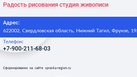 Радость рисования, студия живописи по адресу 622002, Свердловская область, Нижний Тагил, Фрунзе, 19а в дальнейшем Организация, размещена в следующих категориях: