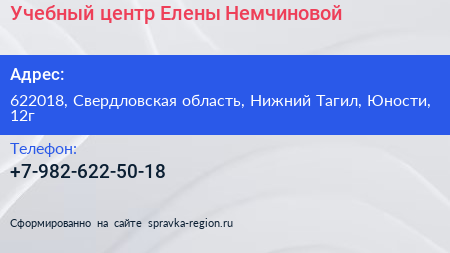 Учебный центр Елены Немчиновой по адресу 622018, Свердловская область, Нижний Тагил, Юности, 12г в дальнейшем Организация, размещена в следующих категориях: