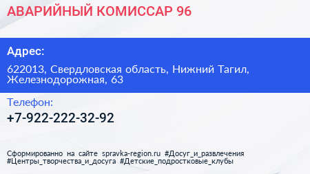 АВАРИЙНЫЙ КОМИССАР 96 по адресу 622013, Свердловская область, Нижний Тагил, Железнодорожная, 63 в дальнейшем Организация, размещена в следующих категориях: