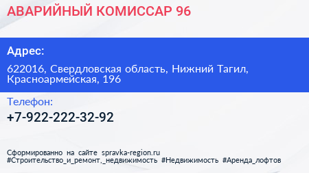 АВАРИЙНЫЙ КОМИССАР 96 по адресу 622016, Свердловская область, Нижний Тагил, Красноармейская, 196 в дальнейшем Организация, размещена в следующих категориях: