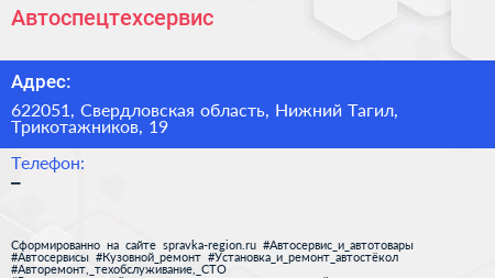 Автоспецтехсервис по адресу 622051, Свердловская область, Нижний Тагил, Трикотажников, 19 в дальнейшем Организация, размещена в следующих категориях: