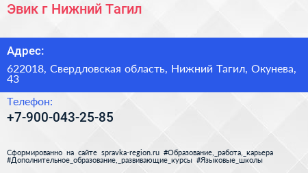 Эвик, г. Нижний Тагил по адресу 622018, Свердловская область, Нижний Тагил, Окунева, 43 в дальнейшем Организация, размещена в следующих категориях: