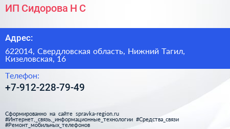 ИП Сидорова Н.С по адресу 622014, Свердловская область, Нижний Тагил, Кизеловская, 16 в дальнейшем Организация, размещена в следующих категориях: