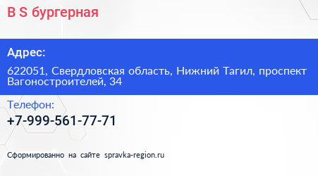 B & S, бургерная по адресу 622051, Свердловская область, Нижний Тагил, проспект Вагоностроителей, 34 в дальнейшем Организация, размещена в следующих категориях: