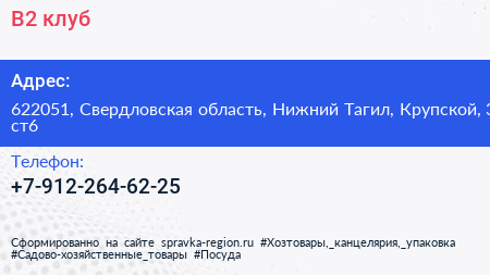 B2, клуб по адресу 622051, Свердловская область, Нижний Тагил, Крупской, 3 ст6 в дальнейшем Организация, размещена в следующих категориях: