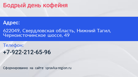 Бодрый день, кофейня по адресу 622049, Свердловская область, Нижний Тагил, Черноисточинское шоссе, 49 в дальнейшем Организация, размещена в следующих категориях: