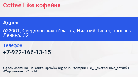 Coffee Like, кофейня по адресу 622001, Свердловская область, Нижний Тагил, проспект Ленина, 32 в дальнейшем Организация, размещена в следующих категориях: