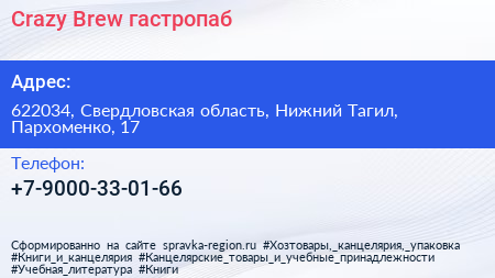 Crazy Brew, гастропаб по адресу 622034, Свердловская область, Нижний Тагил, Пархоменко, 17 в дальнейшем Организация, размещена в следующих категориях: