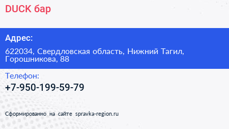 DUCK, бар по адресу 622034, Свердловская область, Нижний Тагил, Горошникова, 88 в дальнейшем Организация, размещена в следующих категориях: