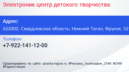 Электроник, центр детского творчества по адресу 622002, Свердловская область, Нижний Тагил, Фрунзе, 52 в дальнейшем Организация, размещена в следующих категориях: