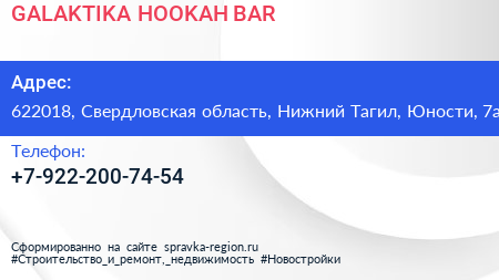 GALAKTIKA-HOOKAH BAR по адресу 622018, Свердловская область, Нижний Тагил, Юности, 7а в дальнейшем Организация, размещена в следующих категориях: