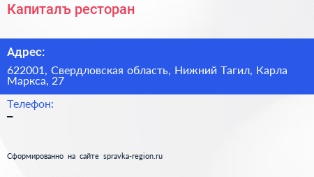 Капиталъ, ресторан по адресу 622001, Свердловская область, Нижний Тагил, Карла Маркса, 27 в дальнейшем Организация, размещена в следующих категориях: