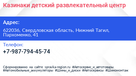 Казинаки, детский развлекательный центр по адресу 622036, Свердловская область, Нижний Тагил, Пархоменко, 41 в дальнейшем Организация, размещена в следующих категориях: