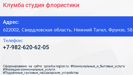Клумба, студия флористики по адресу 622002, Свердловская область, Нижний Тагил, Фрунзе, 58 в дальнейшем Организация, размещена в следующих категориях: