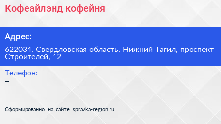 Кофеайлэнд, кофейня по адресу 622034, Свердловская область, Нижний Тагил, проспект Строителей, 12 в дальнейшем Организация, размещена в следующих категориях:
