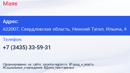 Маяк по адресу 622007, Свердловская область, Нижний Тагил, Ильича, 4 в дальнейшем Организация, размещена в следующих категориях: