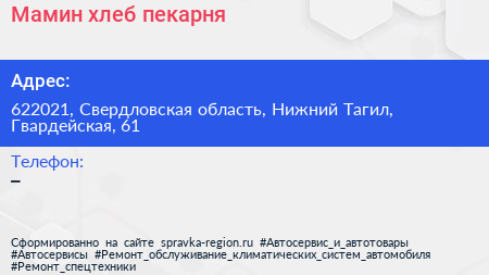 Мамин хлеб, пекарня по адресу 622021, Свердловская область, Нижний Тагил, Гвардейская, 61 в дальнейшем Организация, размещена в следующих категориях: