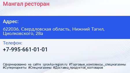 Мангал, ресторан по адресу 622036, Свердловская область, Нижний Тагил, Циолковского, 28а в дальнейшем Организация, размещена в следующих категориях:
