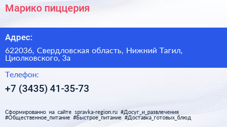 Марико, пиццерия по адресу 622036, Свердловская область, Нижний Тагил, Циолковского, 3а в дальнейшем Организация, размещена в следующих категориях: