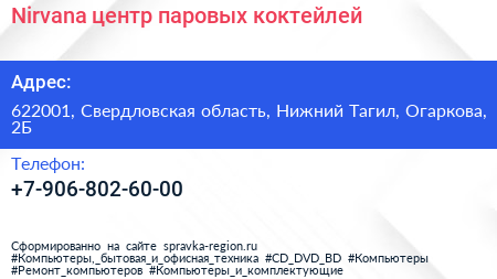 Nirvana, центр паровых коктейлей по адресу 622001, Свердловская область, Нижний Тагил, Огаркова, 2Б в дальнейшем Организация, размещена в следующих категориях: