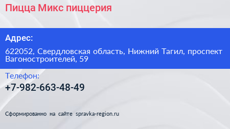 Пицца-Микс, пиццерия по адресу 622052, Свердловская область, Нижний Тагил, проспект Вагоностроителей, 59 в дальнейшем Организация, размещена в следующих категориях: