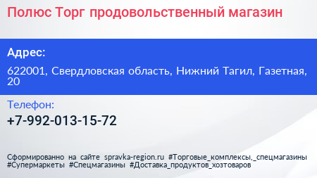 Полюс Торг, продовольственный магазин по адресу 622001, Свердловская область, Нижний Тагил, Газетная, 20 в дальнейшем Организация, размещена в следующих категориях: