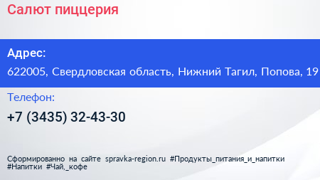 Салют, пиццерия по адресу 622005, Свердловская область, Нижний Тагил, Попова, 19 в дальнейшем Организация, размещена в следующих категориях: