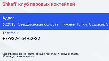 Shkaff, клуб паровых коктейлей по адресу 622013, Свердловская область, Нижний Тагил, Садовая, 3 в дальнейшем Организация, размещена в следующих категориях:
