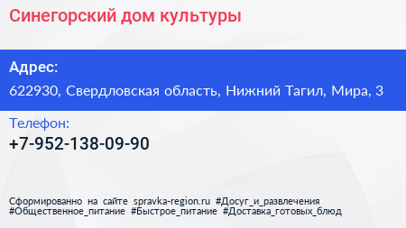 Синегорский дом культуры по адресу 622930, Свердловская область, Нижний Тагил, Мира, 3 в дальнейшем Организация, размещена в следующих категориях: