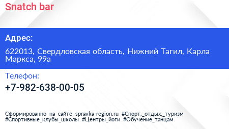 Snatch bar по адресу 622013, Свердловская область, Нижний Тагил, Карла Маркса, 99а в дальнейшем Организация, размещена в следующих категориях: