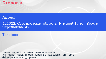 Столовая по адресу 622022, Свердловская область, Нижний Тагил, Верхняя Черепанова, 42 в дальнейшем Организация, размещена в следующих категориях:
