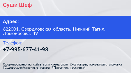 Суши-Шеф по адресу 622001, Свердловская область, Нижний Тагил, Ломоносова, 49 в дальнейшем Организация, размещена в следующих категориях: