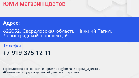 ЮМИ, магазин цветов по адресу 622052, Свердловская область, Нижний Тагил, Ленинградский проспект, 95 в дальнейшем Организация, размещена в следующих категориях:
