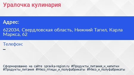 Уралочка, кулинария по адресу 622034, Свердловская область, Нижний Тагил, Карла Маркса, 62 в дальнейшем Организация, размещена в следующих категориях: