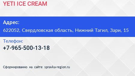 YETI ICE CREAM по адресу 622052, Свердловская область, Нижний Тагил, Зари, 15 в дальнейшем Организация, размещена в следующих категориях:
