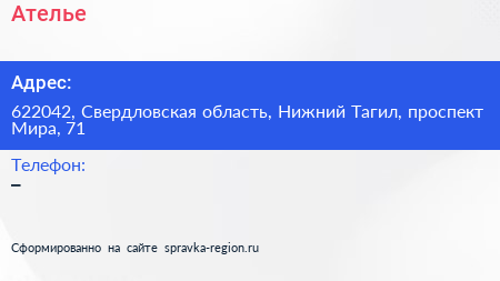 Ателье по адресу 622042, Свердловская область, Нижний Тагил, проспект Мира, 71 в дальнейшем Организация, размещена в следующих категориях: