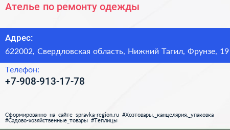 Ателье по ремонту одежды по адресу 622002, Свердловская область, Нижний Тагил, Фрунзе, 19 в дальнейшем Организация, размещена в следующих категориях: