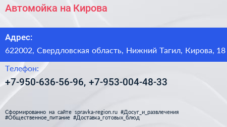 Автомойка на Кирова по адресу 622002, Свердловская область, Нижний Тагил, Кирова, 18 в дальнейшем Организация, размещена в следующих категориях: