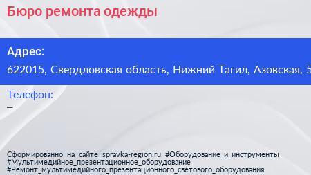 Бюро ремонта одежды по адресу 622015, Свердловская область, Нижний Тагил, Азовская, 5 в дальнейшем Организация, размещена в следующих категориях: