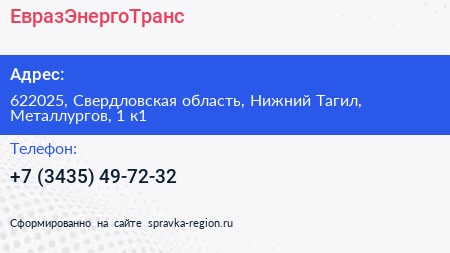ЕвразЭнергоТранс по адресу 622025, Свердловская область, Нижний Тагил, Металлургов, 1 к1 в дальнейшем Организация, размещена в следующих категориях: